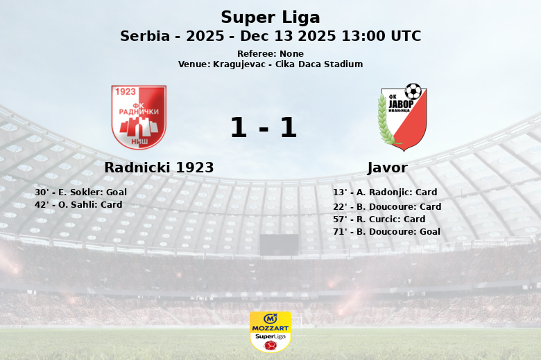 Kragujevac, Serbia – En un encuentro disputado en el Cika Daca Stadium, el Radnicki 1923 y el Javor igualaron en un partido correspondiente a la jornada 19 de la Super Liga Serbia. El partido, jugado el 13 de diciembre de 2025, se caracterizó por la intensidad y el juego físico.