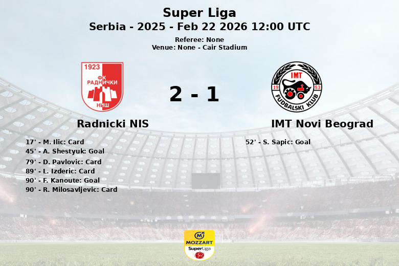 Niš, Serbia – En un encuentro disputado en el Cair Stadium, Radnicki NIS e IMT Novi Beograd empataron en un partido vibrante correspondiente a la jornada 24 de la Super Liga. El Radnicki NIS, que disfrutó del 53% de la posesión, abrió el marcador justo antes del descanso con un gol de A. Shestyuk. Sin embargo, el IMT Novi Beograd reaccionó en la segunda mitad, igualando el marcador a través de S. Sapic. El partido fue de ida y vuelta, con ambos equipos buscando la victoria. El Radnicki NIS, que acumuló un total de 5 tiros, encontró el gol de la victoria agónica en el último minuto del partido, a través de F. Kanoute. El encuentro se caracterizó por un alto número de faltas, 7 cometidas por el Radnicki NIS y 14 por el IMT Novi Beograd. El Radnicki NIS también sufrió la amonestación de cuatro de sus jugadores. El IMT Novi Beograd, por su parte, tuvo mayor presencia en el área rival, obteniendo 7 tiros de esquina, contra sólo 1 del equipo local. Al final, ambos equipos se repartieron los puntos en un partido lleno de emociones.
