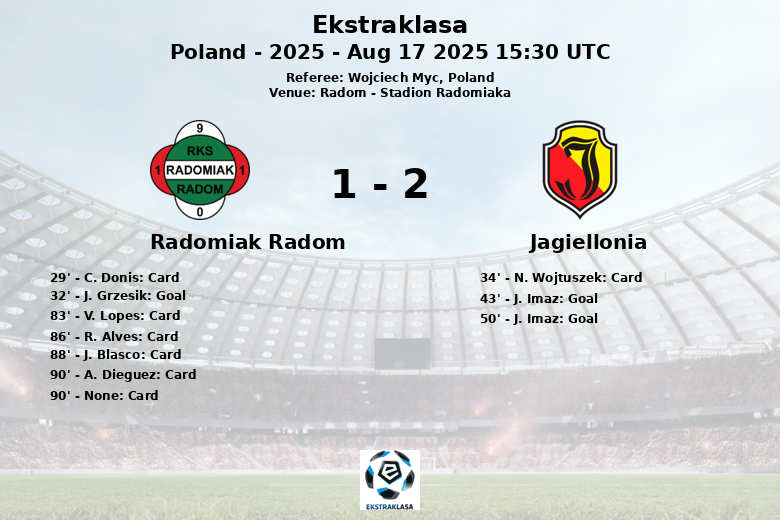 El Radomiak Radom abrió el marcador al minuto 32 gracias a un gol de J. Grzesik, asistido por Joao Pedro. Sin embargo, la alegría local duró poco, ya que J. Imaz igualó las acciones para el Jagiellonia al minuto 43, con asistencia de B. Mazurek.