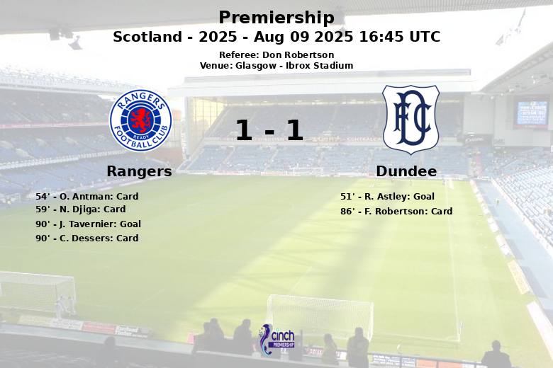 El Dundee se adelantó en el minuto 51 con un gol de R. Astley, asistido por C. Robertson. La alegría visitante, sin embargo, se vio empañada por una fuerte presión del Rangers, que buscó insistentemente el empate. La frustración del equipo local se hizo evidente con una tarjeta amarilla para O. Antman en el minuto 54 y, posteriormente, una tarjeta roja para N. Djiga en el minuto 59.