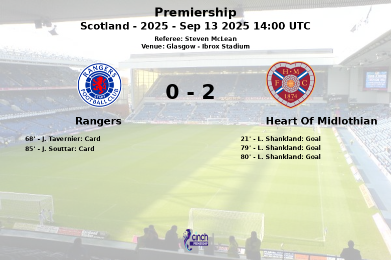 Glasgow, Escocia – El Heart of Midlothian sorprendió al Rangers en su propio terreno, el Ibrox Stadium, con una victoria trabajada en un partido de la Premiership escocesa dominado en posesión por los locales (67%) pero con efectividad letal de los visitantes. El héroe de la jornada fue, sin duda, Lawrence Shankland, autor de dos goles.