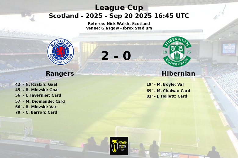 Glasgow, Escocia – El Rangers se impuso al Hibernian en un encuentro cargado de emociones en el Ibrox Stadium, asegurando su pase a las semifinales de la League Cup. El partido, arbitrado por Nick Walsh, tuvo momentos de alta tensión y decisiones controvertidas.