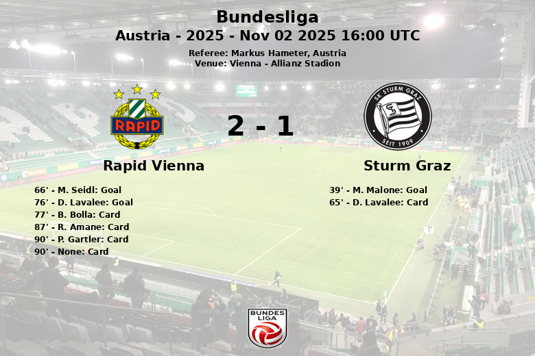 M. Seidl igualó el marcador en el minuto 66, con un gol que devolvió la esperanza a la afición local. El partido tomó un giro inesperado cuando, en el minuto 76, D. Lavalee del Sturm Graz marcó en propia puerta, dando la ventaja al Rapid Vienna. A pesar de los esfuerzos finales del Sturm Graz, el marcador no se movió más.