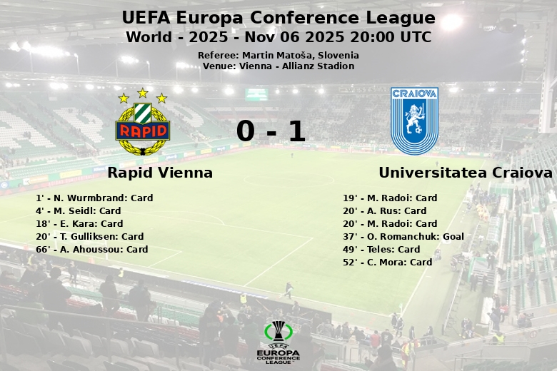 Vienna, Austria – En un partido cargado de tarjetas amarillas y tensión, el Universitatea Craiova se impuso al Rapid Vienna en el Allianz Stadion, dentro de la jornada 3 de la UEFA Europa Conference League. El único gol del encuentro, obra de O. Romanchuk al minuto 37, tras una asistencia de C. Mora, fue suficiente para darle la victoria al equipo rumano.