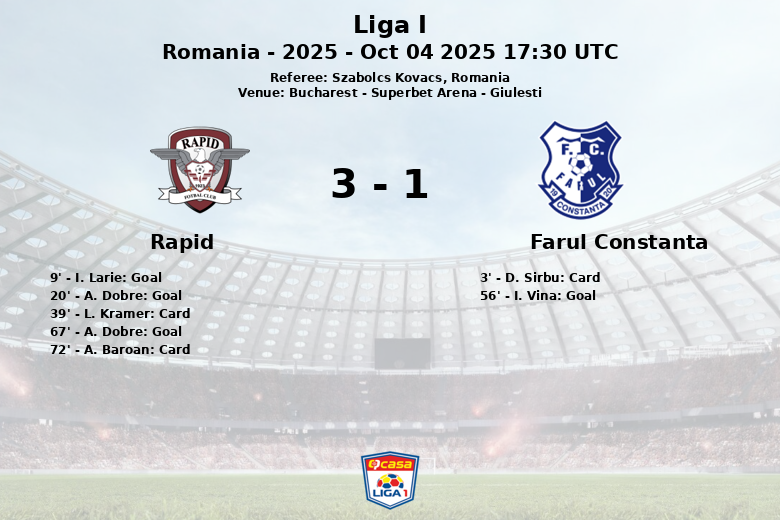 El Rapid tomó la delantera temprano gracias a un autogol de I. Larie al minuto 9, seguido por un gol de A. Dobre al minuto 20, ampliando la ventaja para el equipo local. A pesar de una tarjeta amarilla para D. Sirbu del Farul Constanta al minuto 3 y otra para L. Kramer del Rapid al minuto 39, el juego continuó con intensidad.