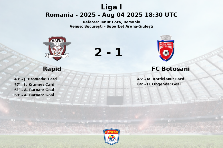 El partido fue supervisado por el árbitro Ionut Coza y se caracterizó por un juego disputado, reflejado en las 13 faltas cometidas por el FC Botoșani y las 10 por el Rapid. El colegiado mostró dos tarjetas amarillas al Rapid y una al FC Botoșani. A pesar de los intentos del FC Botoșani, la efectividad del Rapid en el área rival fue determinante para sellar la victoria. El encuentro, válido por la temporada 2025 de la Liga I, dejó al Rapid como claro vencedor en su propio terreno.