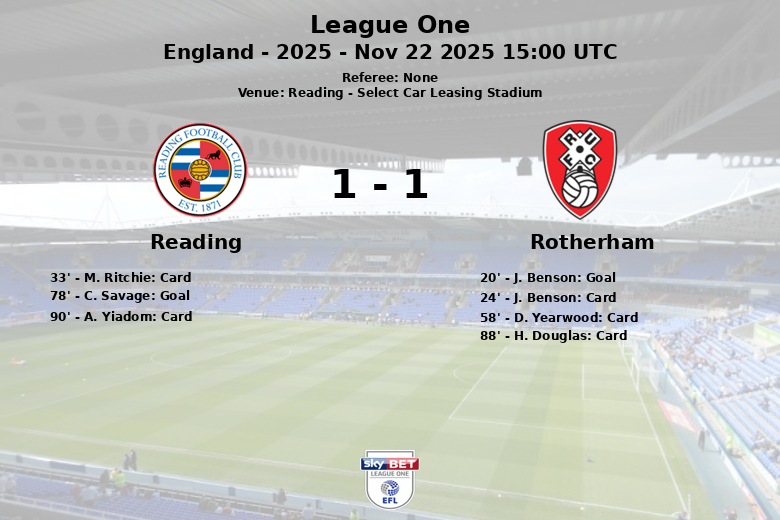 Reading, Inglaterra – En un encuentro disputado en el Select Car Leasing Stadium, Reading y Rotherham United empataron en un partido correspondiente a la jornada 17 de la League One. Rotherham se adelantó en el marcador al minuto 20 con un gol de J. Benson, asistido por D. Hall. Sin embargo, Reading, con una clara superioridad en la posesión del balón (67%), luchó por igualar el encuentro. La recompensa llegó al minuto 78 cuando C. Savage anotó para los locales. A pesar de dominar el juego y generar más ocasiones de gol (10 tiros totales, 6 a puerta), Reading no pudo concretar la victoria. El partido se caracterizó por un juego intenso, reflejado en las cinco tarjetas amarillas mostradas, una para Reading y tres para Rotherham. Rotherham, aunque con menor posesión (33%), se defendió con solidez y buscó contragolpes. El encuentro finalizó con un empate que deja a ambos equipos con sensaciones encontradas.