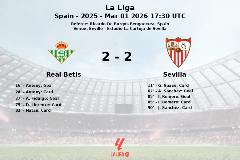 A. Sanchez descontó para el Sevilla al minuto 62, avivado las esperanzas de la afición local. El empate llegó al minuto 85 con un gol de I. Romero, asistido por D. Sow, quien fue amonestado inmediatamente después del gol. El partido se caracterizó por su juego físico, reflejado en las seis tarjetas amarillas mostradas, tres para cada equipo, siendo la primera para G. Suazo al minuto 11. El Sevilla dominó la posesión con un 55% frente al 45% del Betis, y realizó 14 tiros a puerta (6 a puerta), mientras que el Betis generó 9 (2 a puerta). El árbitro, Ricardo De Burgos Bengoetxea, tuvo una noche ocupada en este electrizante encuentro. El pitazo final llegó luego de que J. Sanchez recibiera otra tarjeta amarilla para el Sevilla al minuto 90.