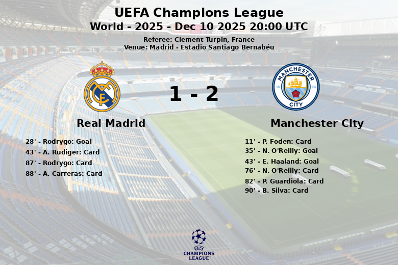Madrid, España – En un emocionante encuentro disputado en el Estadio Santiago Bernabéu, Real Madrid y Manchester City igualaron el marcador en un partido correspondiente a la fase de grupos de la UEFA Champions League. El duelo, marcado por la intensidad y la lucha en cada sector del campo, finalizó con un resultado que refleja lo parejo del enfrentamiento.