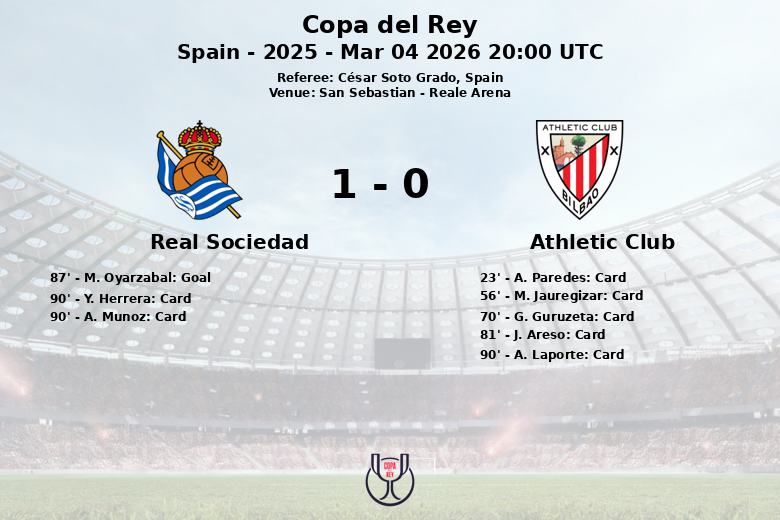 San Sebastián fue testigo de un derbi vasco cargado de tensión y emoción en la semifinal de la Copa del Rey. La Real Sociedad se impuso al Athletic Club en un partido disputado en el Reale Arena, con un marcador final de 1-0. El encuentro, arbitrado por César Soto Grado, estuvo marcado por un alto número de faltas (28 en total) y tarjetas amarillas (6 para el Athletic Club y 3 para la Real Sociedad).