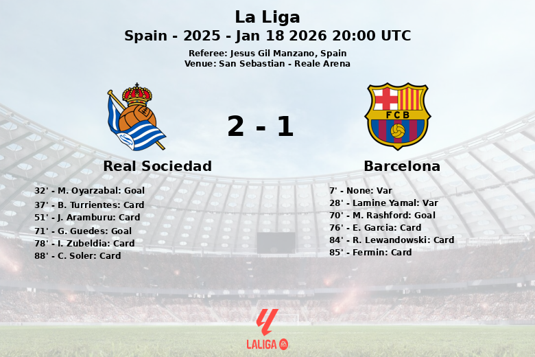 El partido comenzó con polémica, con dos goles anulados al Barcelona por el VAR, uno en el minuto 7 y otro en el 28, frustrando las aspiraciones tempraneras del equipo visitante. La Real Sociedad aprovechó su momento, y al minuto 32, M. Oyarzabal abrió el marcador con un gol, asistido por G. Guedes. La intensidad del juego se vio reflejada en varias tarjetas amarillas, primero para B. Turrientes de la Real Sociedad al minuto 37 y luego para J. Aramburu al minuto 51.