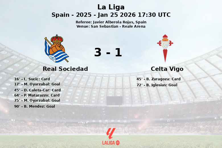 San Sebastián, España – La Real Sociedad se impuso al Celta de Vigo en un encuentro vibrante y lleno de emociones disputado en el Reale Arena. El marcador final fue de 3 a 1 a favor del equipo local, en un partido marcado por la intensidad y la polémica.