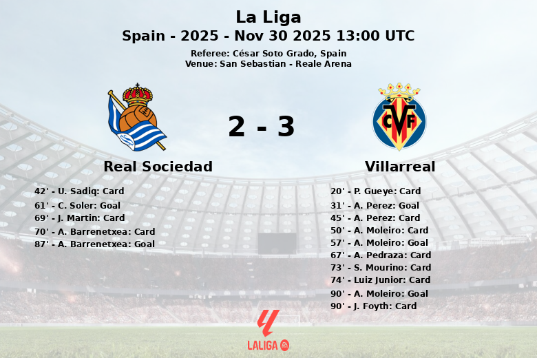 En la segunda mitad, A. Moleiro amplió la ventaja para el Villarreal al minuto 57, con una asistencia nuevamente de A. Perez. La Real Sociedad no se rindió y C. Soler descontó al minuto 61, con una asistencia de T. Kubo. El partido continuó con intensidad, reflejada en el elevado número de faltas y tarjetas amarillas. Cuando parecía que el partido podría terminar en empate, A. Barrenetxea anotó para la Real Sociedad al minuto 87. Sin embargo, A. Moleiro del Villarreal selló la victoria para su equipo al minuto 90.