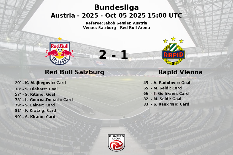 El Salzburg tomó la delantera en el minuto 38 gracias a un gol de S. Diabate, asistido por C. Bischoff. Sin embargo, el Rapid Vienna respondió justo antes del descanso, en el minuto 45, con un gol de A. Radulovic, tras una asistencia de M. Seidl.