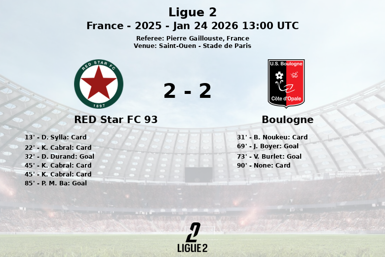 El partido finalizó con un reparto de puntos, reflejo de un encuentro disputado y con alternativas para ambos equipos. El Red Star FC 93 dominó la posesión en un 48%, generando 9 tiros, de los cuales 5 fueron a puerta. Por su parte, el Boulogne tuvo un 52% de posesión, con 10 tiros totales y también 5 a puerta. El árbitro Pierre Gaillouste mostró 4 tarjetas amarillas y una roja al Red Star FC 93, y una amarilla al Boulogne.
