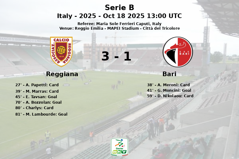 La segunda mitad fue aún más intensa. Al minuto 59, el Bari sufrió un duro golpe con la expulsión de D. Nikolaou. La Reggiana aprovechó la superioridad numérica y A. Bozzolan adelantó a su equipo al minuto 70, con asistencia de E. Tavsan. La Reggiana no se detuvo ahí y M. Lambourde amplió la ventaja al minuto 81.