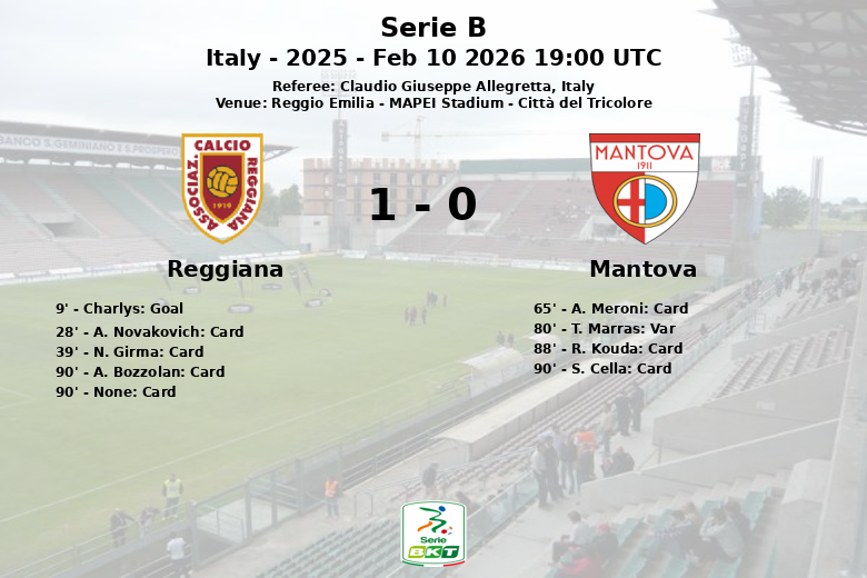 La intensidad del juego también se vio reflejada en las tarjetas. Por Reggiana, A. Novakovich y N. Girma vieron la tarjeta amarilla, mientras que por Mantova, A. Meroni y R. Kouda también fueron amonestados. El encuentro también tuvo un momento de tensión cuando un gol de T. Marras para Mantova fue anulado tras la revisión del VAR en el minuto 80. El árbitro Claudio Giuseppe Allegretta tuvo una noche ocupada, mostrando varias tarjetas en los minutos finales del partido. Finalmente, Reggiana supo defender su ventaja y asegurar los tres puntos ante su público.