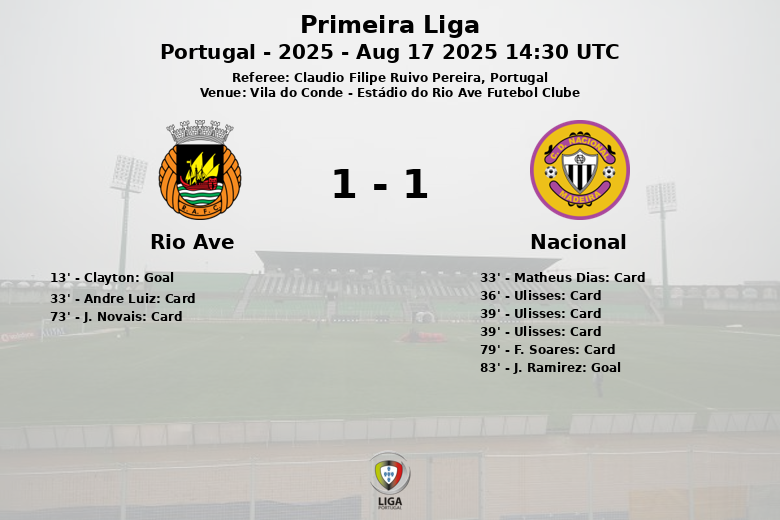 Vila do Conde, Portugal – En un encuentro disputado en el Estádio do Rio Ave Futebol Clube, el Rio Ave y el Nacional firmaron un empate con un gol para cada equipo en un partido cargado de emociones y tarjetas.