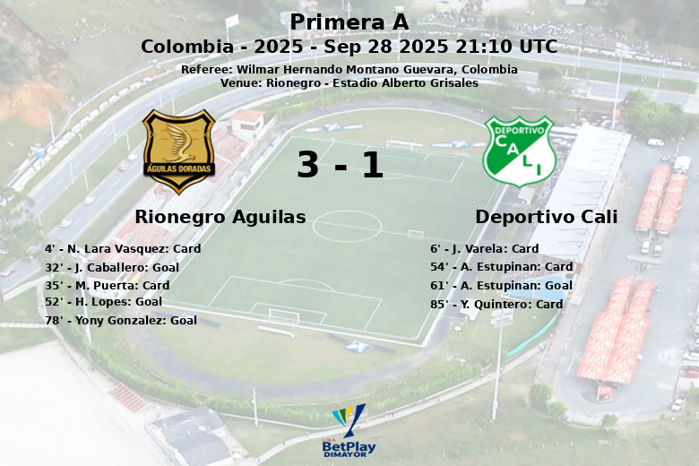 Rionegro, Colombia – En un partido vibrante y cargado de emociones, Rionegro Águilas derrotó al Deportivo Cali en el Estadio Alberto Grisales por la fecha 13 del Clausura de la Primera A colombiana. El encuentro, disputado el 28 de septiembre de 2025, se caracterizó por un juego intenso y un alto número de amonestaciones.