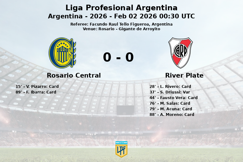 Un gol de S. Driussi para River Plate fue anulado por el VAR por fuera de juego en el minuto 37, generando controversia entre los aficionados del equipo visitante. A pesar del dominio en la posesión y el mayor número de intentos al arco, River Plate no logró concretar su superioridad en el marcador, dejando a Rosario Central con un valioso punto en casa. El encuentro se desarrolló el 2 de febrero de 2026.