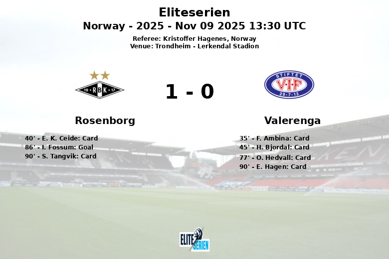 Trondheim, 9 de noviembre de 2025 – El Rosenborg se impuso al Valerenga en el Lerkendal Stadion en un partido de la Eliteserien dominado por el equipo local. El Rosenborg controló el balón durante la mayor parte del encuentro, acumulando un 74% de posesión. A pesar de la superioridad numérica del Valerenga tras la tarjeta roja mostrada a F. Ambina en el minuto 35, el Rosenborg no logró abrir el marcador hasta los últimos minutos.