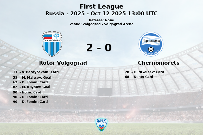 Volgograd, Rusia – En un partido correspondiente a la fecha 14 de la temporada regular de la First League, el Rotor Volgograd venció al Chernomorets en el Volgograd Arena. El encuentro, marcado por varias tarjetas y un ritmo intenso, culminó con un resultado favorable al equipo local.