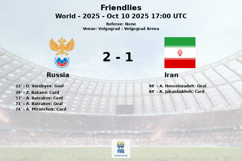 El partido se caracterizó por una alta intensidad, reflejada en las 25 faltas cometidas en total y las 4 tarjetas amarillas mostradas (3 para Rusia y 1 para Irán). A pesar de los esfuerzos de ambos equipos en la recta final, el marcador no se movió, sellando un empate que dejó un buen sabor de boca para los espectadores en Volgogrado. Rusia contó con 7 tiros de esquina a favor y 9 faltas cometidas, mientras que Irán registró 6 tiros de esquina y 16 faltas.
