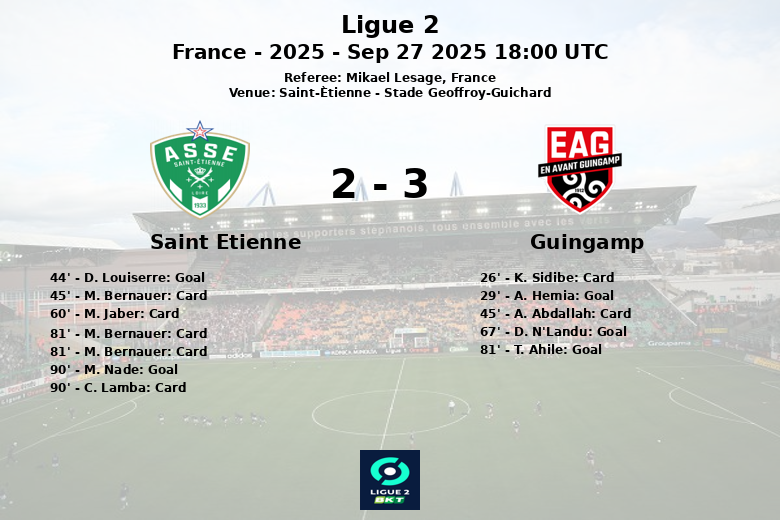En la segunda mitad, el Guingamp volvió a tomar la delantera al minuto 67 con un gol de D. N’Landu. La situación se complicó aún más para el Saint Etienne cuando T. Ahile anotó el tercer gol para el Guingamp al minuto 81, momento en el cual M. Bernauer recibió su segunda tarjeta amarilla y, por ende, la roja, dejando a su equipo con diez hombres. El Saint Etienne intentó reaccionar y logró descontar con un gol de M. Nade al minuto 90, asistido por F. Tardieu, pero ya era demasiado tarde. El Guingamp selló la victoria con un cuarto gol.