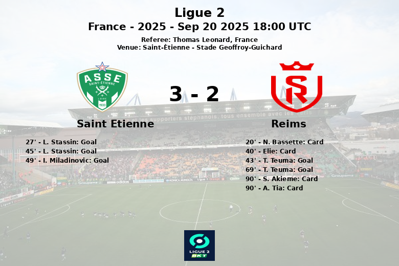 El Reims, aunque con menor posesión (41%), también fue peligroso, realizando 17 disparos, con 7 dirigidos al arco. T. Teuma anotó dos goles para el Reims, uno de penalti (minuto 43) y otro en el minuto 69. El partido fue físico, con 24 faltas cometidas por el Reims, que además vio tres tarjetas amarillas (N. Bassette, Elie, y S. Akieme, y A. Tia). El Saint-Étienne cometió 8 faltas y no recibió ninguna amonestación.