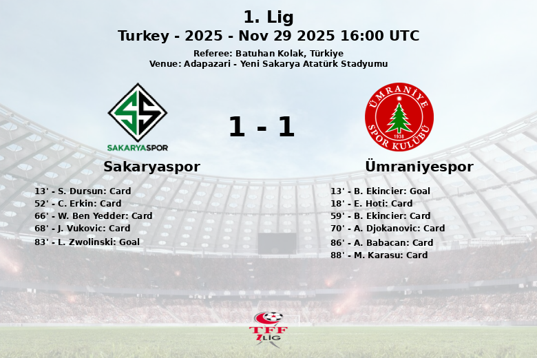 A pesar de jugar con diez hombres, Sakaryaspor perseveró y finalmente encontró la recompensa en el minuto 83, cuando L. Zwolinski anotó un gol tras una asistencia de G. Kakuta, estableciendo el empate final. El partido concluyó con un total de 16 faltas cometidas por Sakaryaspor y 21 por Ümraniyespor, reflejando la dureza del encuentro.