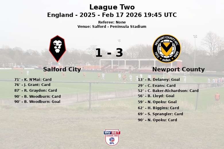 El encuentro comenzó con un gol tempranero de R. Delaney en el minuto 13 para Newport County, con asistencia de T. Davies. B. Lloyd amplió la ventaja en el minuto 56 y N. Opoku sentenció el partido con un tercer gol en el minuto 59. Salford City, aunque intentó reaccionar, solo pudo anotar un gol en el tiempo de descuento por medio de B. Woodburn.