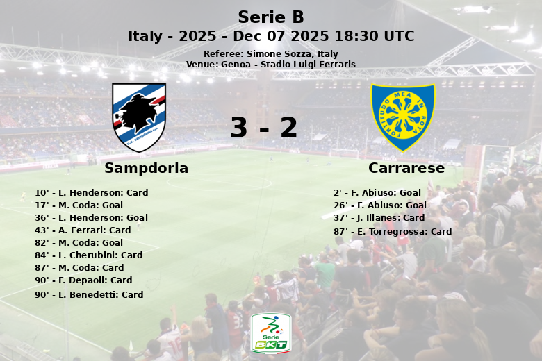 El Carrarese golpeó primero al minuto 2 con un gol de F. Abiuso, asistido por M. Finotto, pero la Sampdoria respondió con contundencia. M. Coda igualó las acciones al minuto 17, tras una asistencia de S. Pafundi. No obstante, el Carrarese volvió a tomar la delantera al minuto 26 con otro gol de F. Abiuso, esta vez con asistencia de S. Zanon. El primer tiempo continuó con intensidad, y L. Henderson emparejó el marcador para la Sampdoria al minuto 36, asistido por M. Coda.