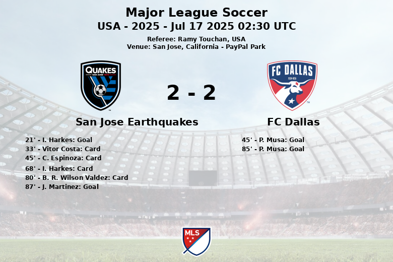 I. Harkes abrió el marcador para los locales al minuto 21, pero P. Musa igualó para el FC Dallas justo antes del descanso. El segundo tiempo fue igualmente intenso, con Musa volviendo a marcar para el FC Dallas al minuto 85. Sin embargo, J. Martinez respondió rápidamente para los Earthquakes al minuto 87, sellando el empate.