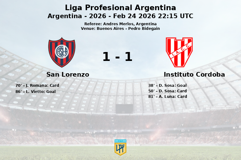 Instituto se adelantó en el marcador al minuto 38 gracias a un gol de D. Sosa, asistido por J. Mendez. El equipo cordobés se mostró sólido y con una buena propuesta ofensiva, generando un total de 15 tiros, de los cuales 6 fueron dirigidos al arco defendido por el portero de San Lorenzo. La posesión del balón fue mayoritariamente para el conjunto local con un 58%, mientras que Instituto se replegó y apostó por el contragolpe. El encuentro tuvo momentos de tensión, reflejados en las tarjetas amarillas mostradas a D. Sosa y A. Luna por el lado de Instituto, y a J. Romana por San Lorenzo. Finalmente, San Lorenzo logró igualar el marcador al minuto 86 con un gol de L. Vietto.