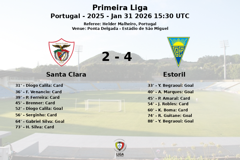 El Estoril tomó la delantera temprano con un gol de penalti de Y. Begraoui al minuto 33. A. Marques amplió la ventaja al minuto 40 con una asistencia de Pizzi, dejando al Santa Clara en una situación complicada al término de la primera mitad. No obstante, los locales reaccionaron en la segunda parte.