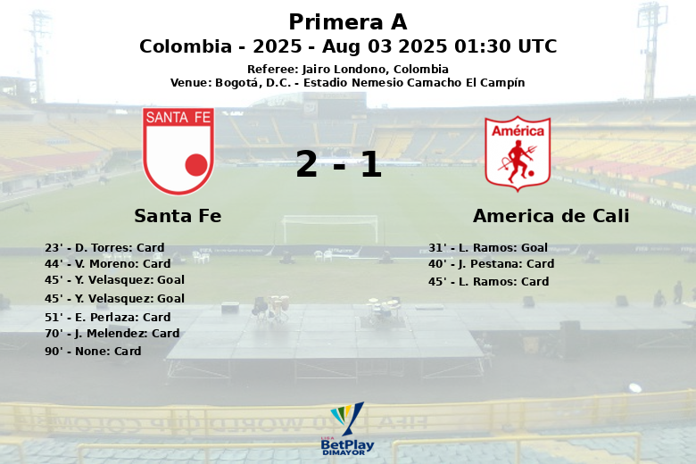 El primer gol del partido llegó al minuto 31, cortesía de L. Ramos para el América de Cali, con una asistencia de C. Barrios. Sin embargo, Santa Fe respondió justo antes del descanso. Y. Velasquez igualó el marcador al minuto 45, asistido por O. Fernandez y de nuevo al minuto 45, asistido por A. Rodriguez.