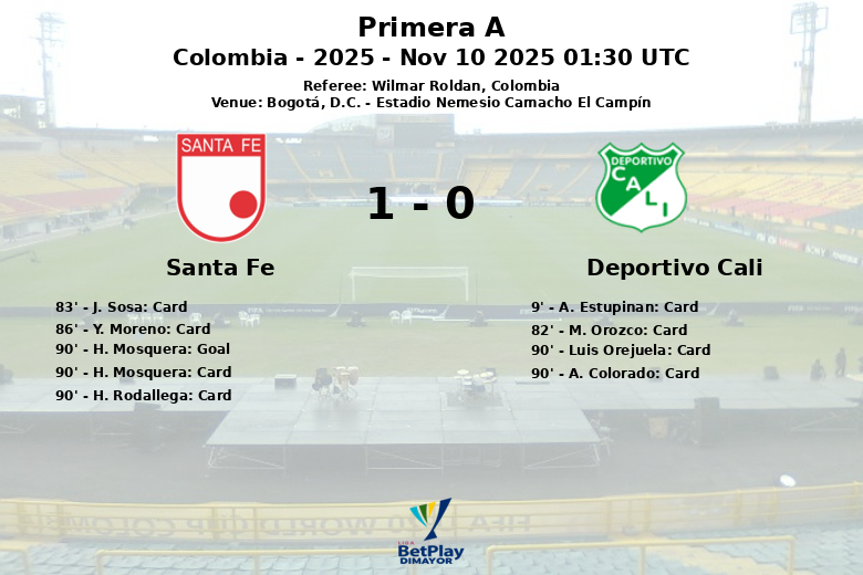 Bogotá, D.C. – En un encuentro disputado en el Estadio Nemesio Camacho El Campín, Santa Fe logró una agónica victoria frente a Deportivo Cali por la mínima diferencia. El partido, correspondiente a la jornada 19 del Clausura de la Primera A colombiana, estuvo marcado por la intensidad y la alta tensión, reflejada en la gran cantidad de tarjetas amarillas mostradas por el árbitro Wilmar Roldán.