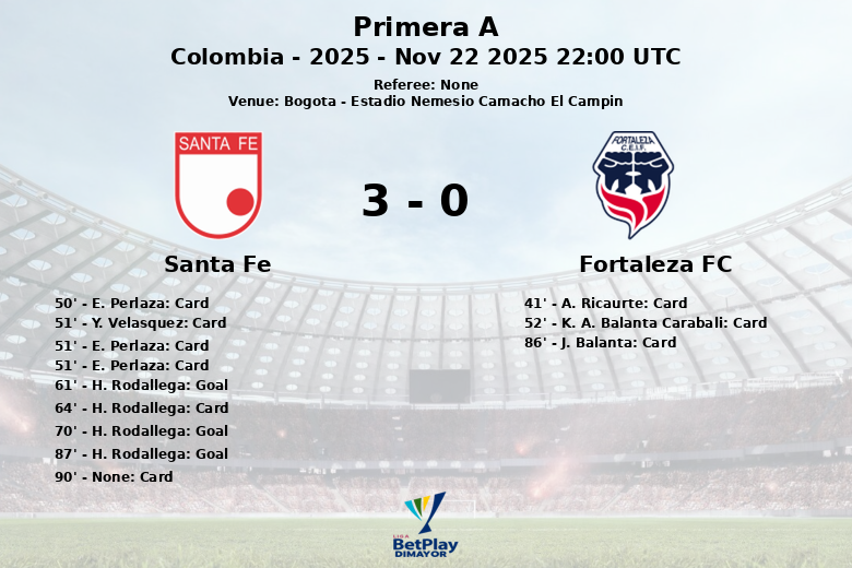 A pesar de las numerosas tarjetas mostradas (4 amarillas y 1 roja para Santa Fe, y 3 amarillas para Fortaleza FC), Santa Fe se llevó la victoria en este encuentro de la Primera A colombiana.