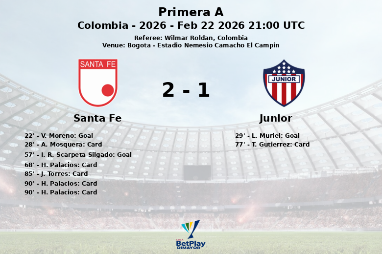 Bogotá, Colombia – En un partido vibrante disputado en el Estadio Nemesio Camacho El Campín, Santa Fe se impuso a Junior con un marcador final de 2 a 1. El encuentro, correspondiente a la octava jornada de la temporada 2026 de la Primera A, estuvo marcado por la intensidad y la polémica, con varias tarjetas mostradas por el árbitro Wilmar Roldán.