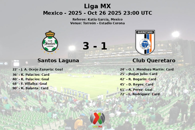 Torreón, México – En un partido disputado en el Estadio Corona, Santos Laguna venció al Club Querétaro en un encuentro vibrante correspondiente a la jornada 15 del Apertura de la Liga MX. El marcador final reflejó la intensidad del juego, que se caracterizó por un alto número de tarjetas amarillas mostradas al equipo visitante.