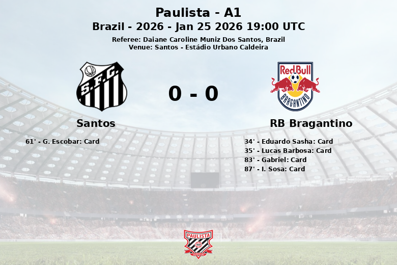 Santos, 25 de enero de 2026 – El encuentro entre Santos y RB Bragantino en el Estádio Urbano Caldeira finalizó en empate sin goles, en un partido disputado por la quinta jornada de la temporada regular de la Paulista A1. Bajo la atenta mirada del árbitro Daiane Caroline Muniz Dos Santos, el partido se caracterizó por su intensidad en el mediocampo y la escasez de oportunidades claras de gol.