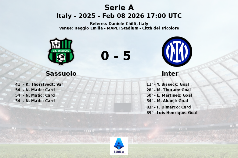 La segunda mitad continuó con el control del Inter. L. Martinez amplió la ventaja al minuto 50, y M. Akanji anotó el cuarto gol al minuto 54, nuevamente con asistencia de Dimarco. El Sassuolo sufrió un duro golpe con la expulsión de N. Matic en el minuto 54, tras recibir dos tarjetas amarillas consecutivas. A pesar de jugar con diez hombres, el Inter continuó atacando y Luis Henrique selló la victoria con un gol en el minuto 89.