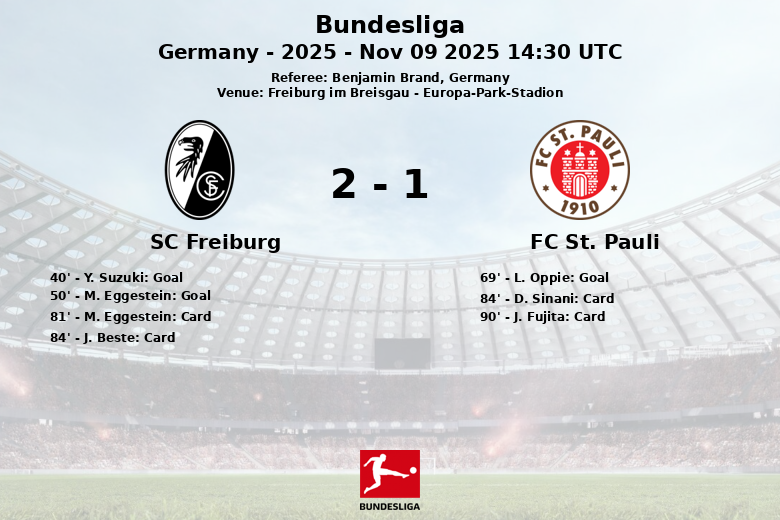 El Freiburg abrió el marcador al minuto 40 gracias a un gol de Y. Suzuki, tras una jugada sin asistencia. Ya en la segunda mitad, M. Eggestein amplió la ventaja para los locales al minuto 50, asistido por J. Beste. Cuando parecía que el partido estaba sentenciado, el FC St. Pauli reaccionó y L. Oppie descontó al minuto 69, con asistencia de C. Metcalfe.