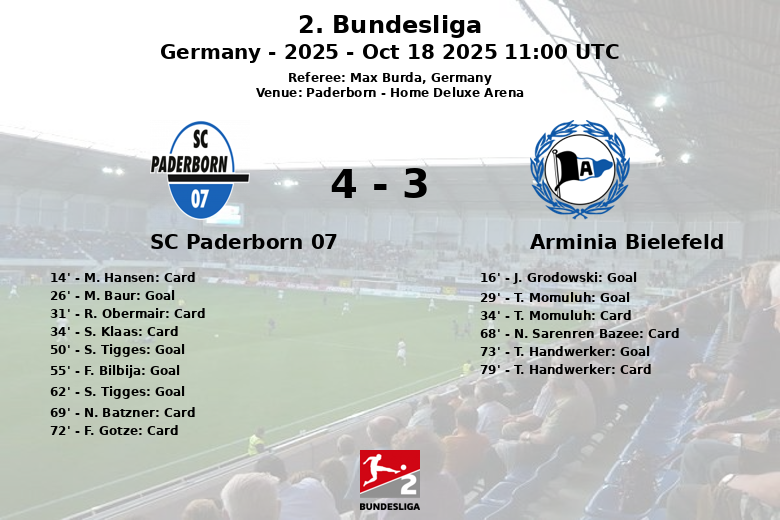 El Bielefeld abrió el marcador temprano con un penal convertido por J. Grodowski en el minuto 16. Sin embargo, el Paderborn reaccionó rápidamente, y M. Baur igualó el encuentro en el minuto 26 con un gol producto de una asistencia de F. Bilbija. La alegría local fue efímera, ya que T. Momuluh volvió a adelantar al Bielefeld al minuto 29.