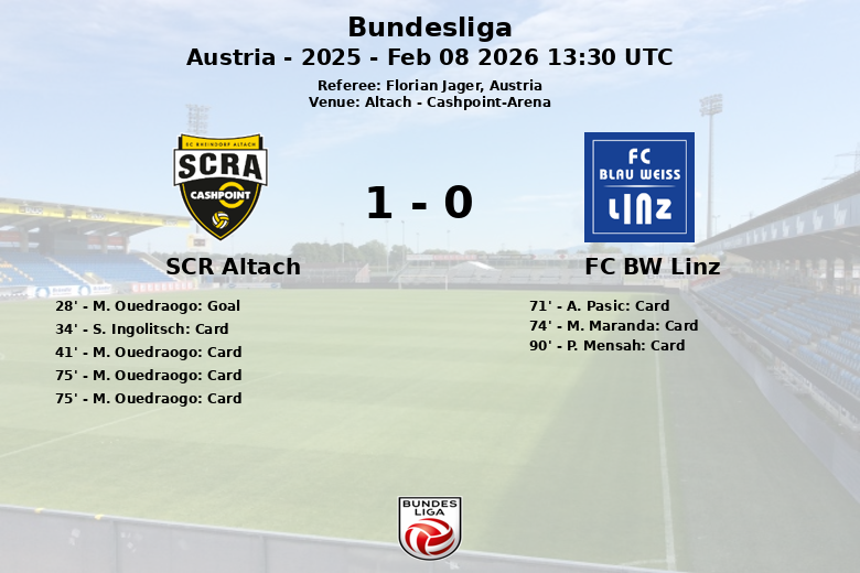 El SCR Altach abrió el marcador en el minuto 28 gracias a un gol de M. Ouedraogo, asistido por V. Demaku, desatando la alegría en la afición local. Sin embargo, el partido se tornó áspero con el paso de los minutos. S. Ingolitsch recibió una tarjeta amarilla en el minuto 34, seguida por otra para el propio Ouedraogo en el minuto 41.