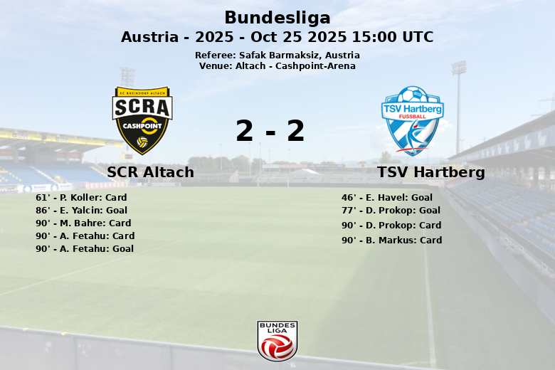 El marcador se abrió al inicio del segundo tiempo (minuto 46) con un gol de E. Havel, asistido por L. Spendlhofer, dando la ventaja al Hartberg. El SCR Altach intentó reaccionar, pero sufrió un duro golpe cuando D. Prokop amplió la ventaja del Hartberg al minuto 77, con asistencia de M. Hennig.