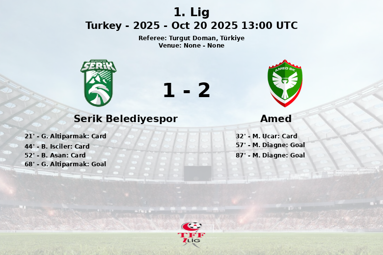 El primer gol del partido llegó en el minuto 57, obra de M. Diagne para Amed, con asistencia de H. A. Kaldirim. Sin embargo, Serik Belediyespor respondió con rapidez, igualando el marcador en el minuto 68 gracias a G. Altiparmak, asistido por I. Berkovsky.