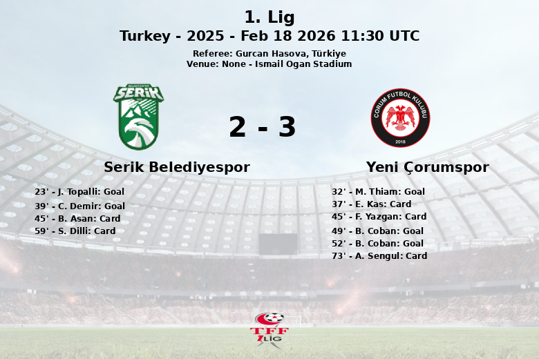 El Ismail Ogan Stadium fue testigo de un partido vibrante donde el Yeni Çorumspor logró remontar un marcador adverso para finalmente imponerse al Serik Belediyespor. El encuentro, correspondiente a la jornada 26 de la 1. Lig turca, dejó a los aficionados al borde de sus asientos.