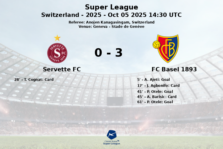 Ginebra, 5 de octubre de 2025 – El FC Basel 1893 se llevó una importante victoria en el Stade de Genève ante el Servette FC en un partido correspondiente a la octava jornada de la Super League suiza. El encuentro, arbitrado por Anojen Kanagasingam, se resolvió con un marcador favorable al Basel.