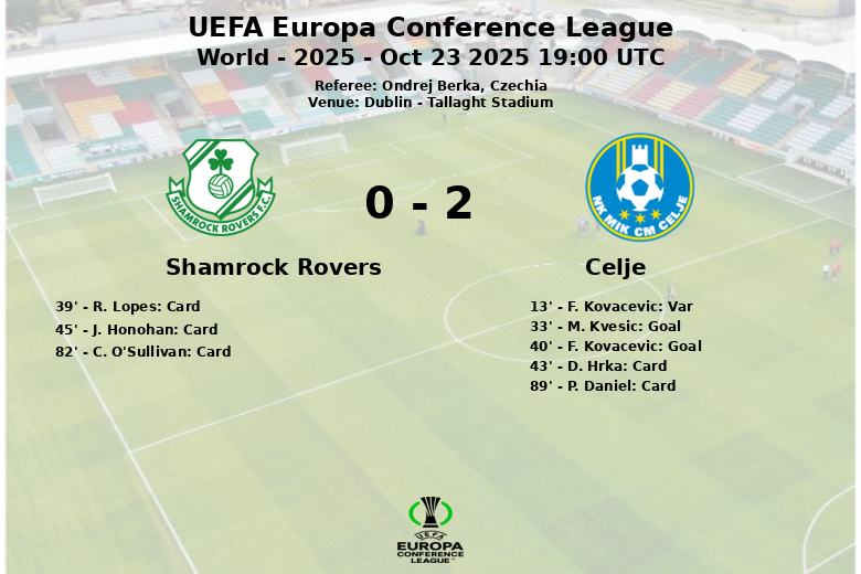El Celje se impuso al Shamrock Rovers en el Tallaght Stadium de Dublín, en un partido correspondiente a la UEFA Europa Conference League. A pesar de que el Shamrock Rovers tuvo un 44% de la posesión, no logró capitalizarlo en el marcador. El Celje, con un 56% de posesión, demostró mayor efectividad y contundencia en el ataque.
